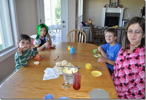 Making popcorn as part of a “transfiguration class.” We made it on the stove after reading the book Popcorn by Tomie de Paola. There is a killer recipe in the back of the book for stovetop popcorn. My kids have only experienced the microwave and air popper kind—so, making popcorn on the stove was a blast. Literally. I was pretty liberal in adding the corn to the sizzling pan—and the popping kernels lifted the lid as they popped and sent popcorn flying everywhere. It was awesome. Calvin thought it was so funny he couldn’t stop laughing and jumping around.